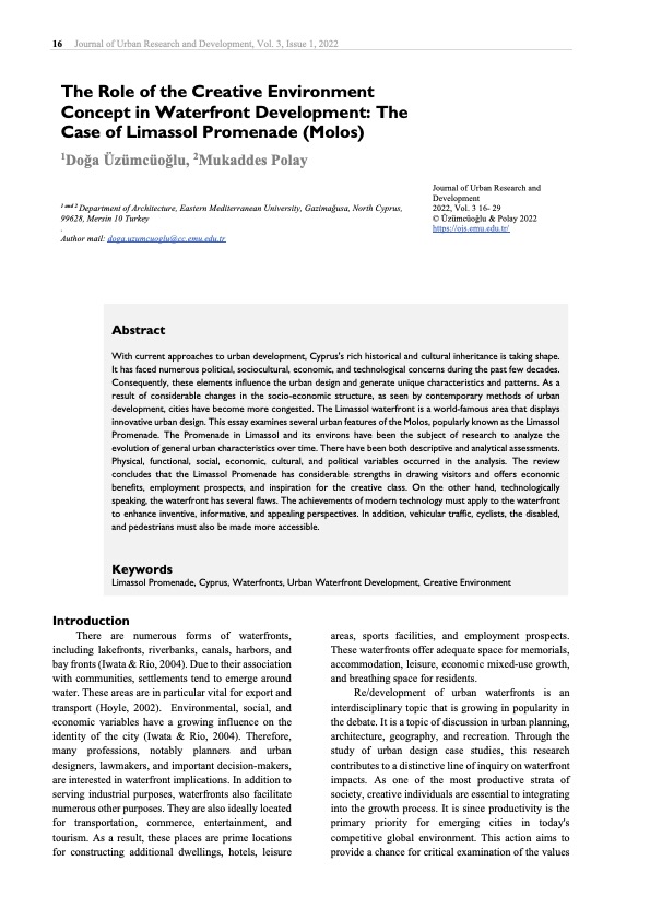The Role of the Creative Environment Concept in Waterfront Development: The Case of Limassol Promenade (Molos)